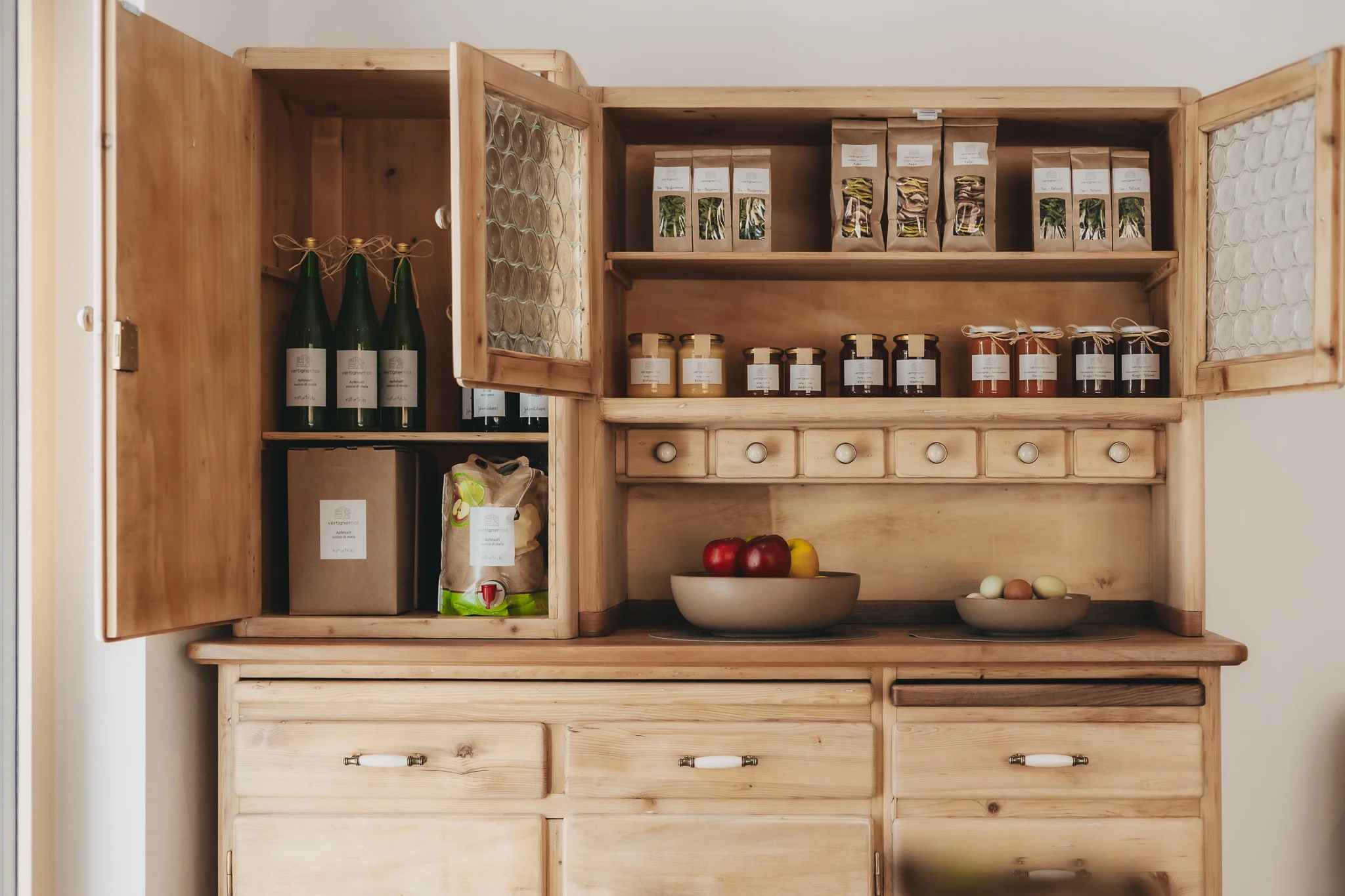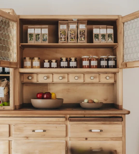 Unsere Äpfel veredelt Iris zu reinem Apfelsaft und getrockneten Apfelringen. Noch dazu stellt sie aus unserem Obst und den Kräutern verschiedene Fruchtaufstriche, Früchte- und Blättersirupe sowie Tees aus Einzelkräutern her. In unserem Produktkorb finden sich auch frische Eier von unseren glücklichen Hühnern und der Honig unserer Bienen. Die Verkaufsecke mit unseren hofeigenen Produkten findet ihr im Aufenthaltsraum: Gerne könnt ihr dort unsere Erzeugnisse fürs Frühstück oder als Mitbringsel erwerben. Je nach Saison variiert das Sortiment, das wir euch anbieten können.